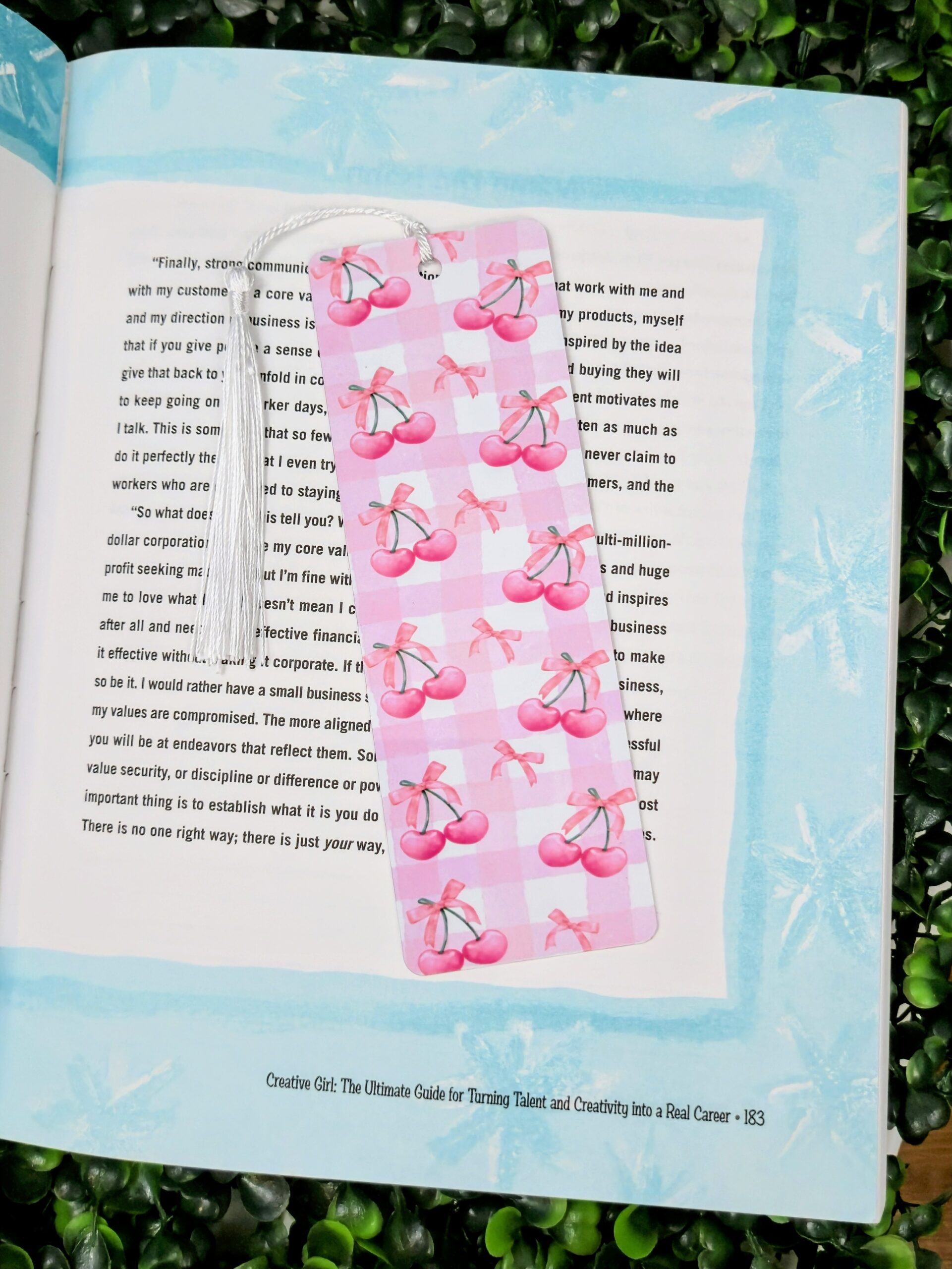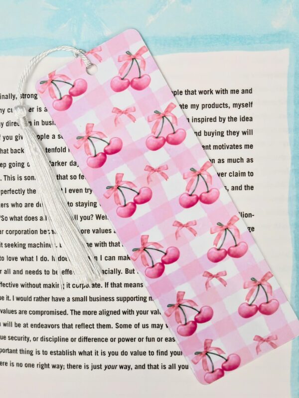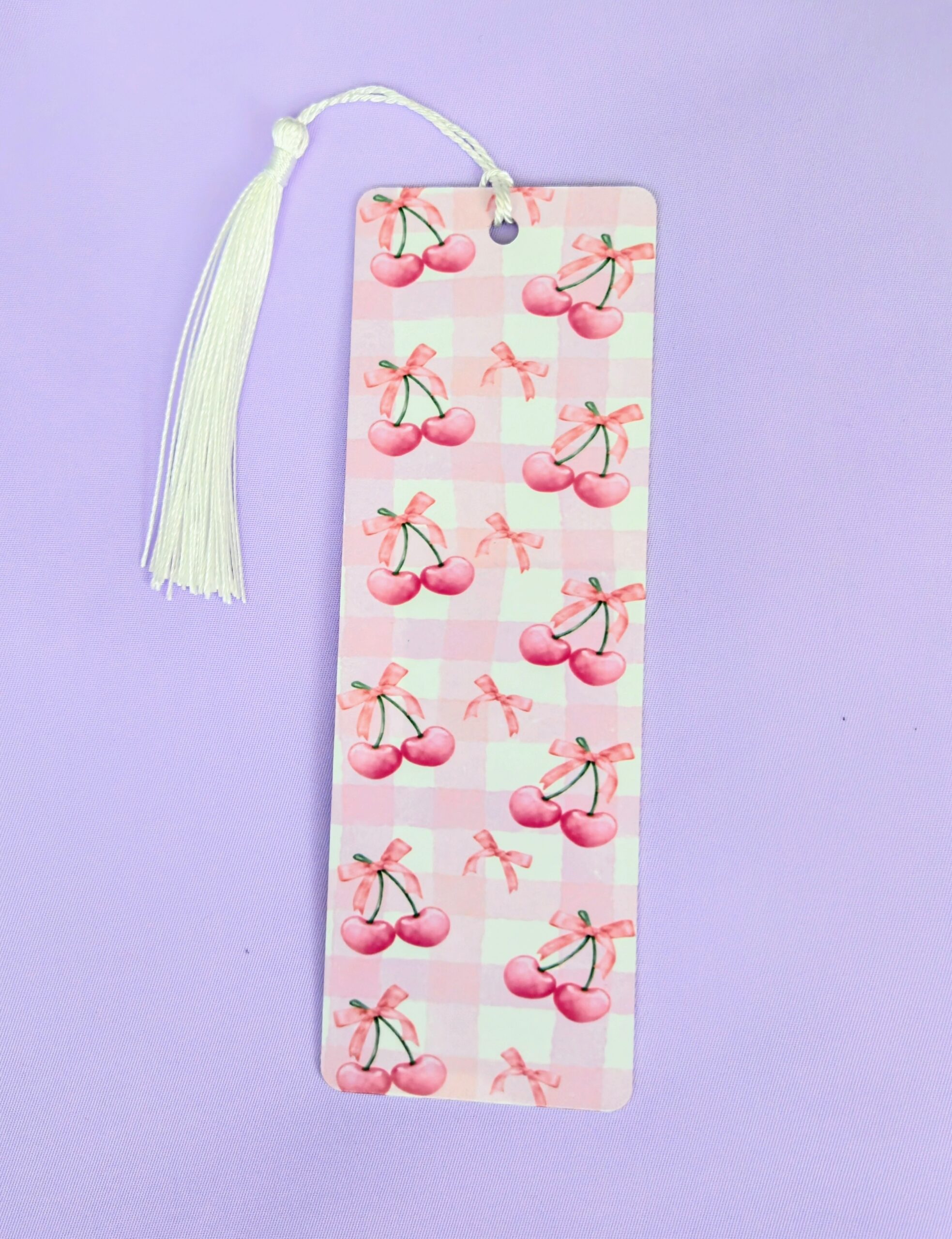 Sweeten your reading time with our Cherry & Bows Gingham Metal Bookmark! With a double-sided pink cherry & bow print on soft pink gingham, this glossy aluminum bookmark is designed to make your books pop. The white tassel adds the perfect polished touch, and its sturdy metal body ensures it won’t bend like traditional bookmarks.