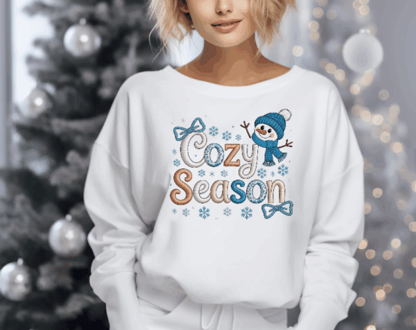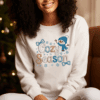This sweatshirt is your winter mood in wearable form! Featuring a smiling snowman in a blue hat and scarf, surrounded by faux embroidered snowflakes and bows, it’s the perfect pullover for chilly days and warm hearts.