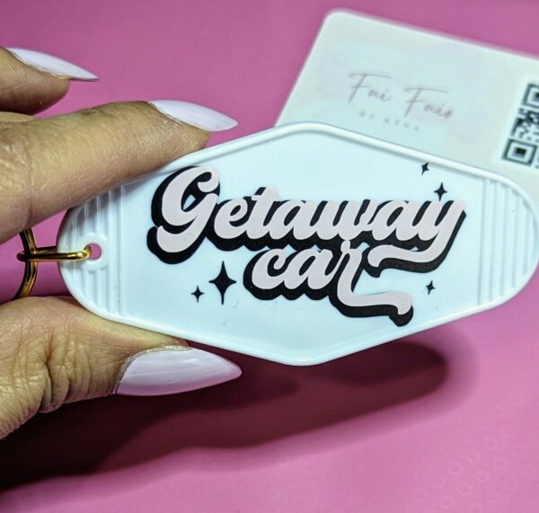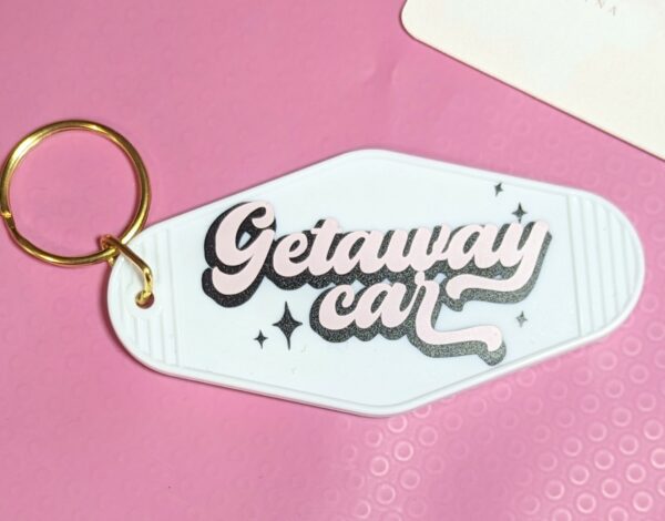 Are you ready to hit the road and go on a spontaneous adventure? Well, we have the perfect accessory for you! Introducing our “Getaway Car” motel keychain! This white keychain with a retro font will not only keep your keys organized, but it will also remind you to embrace your inner adventurer.