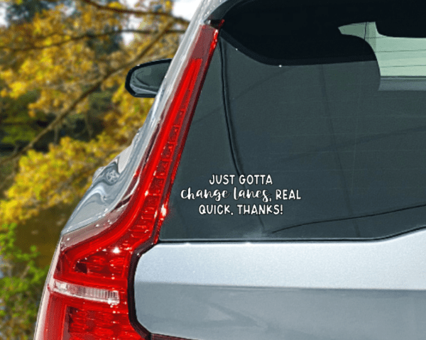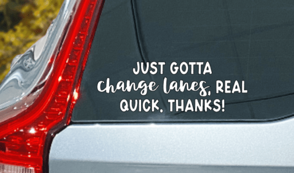 Switching lanes can be a drag during rush hour. But why not add a little laughter to your highway routine? Our latest decal is the perfect chuckle-inducing signal to flash at fellow drivers when you’re itching to switch lanes. Say it with us: “Just Gotta Change Lanes Real Quick, Thanks!”
