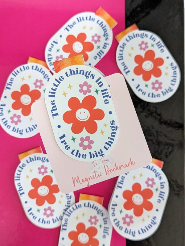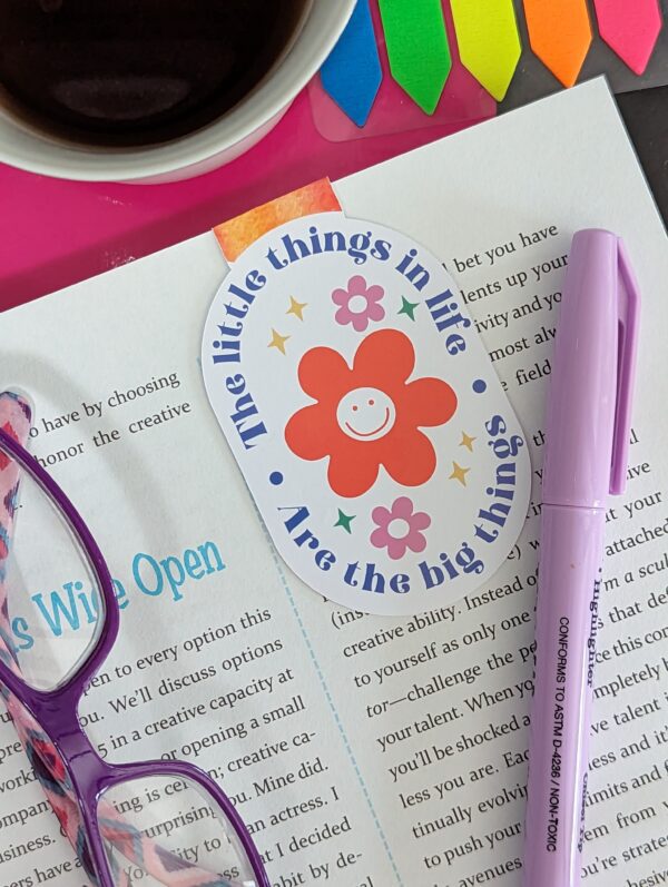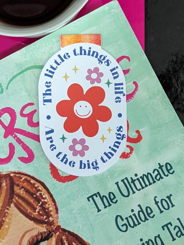 This Magnetic Bookmark reads “The Little Things Are the Big Things” with an adorable orange smiling daisy in the center. It is oval and measures 3.25″ when closed and almost 2 1/8″ wide.