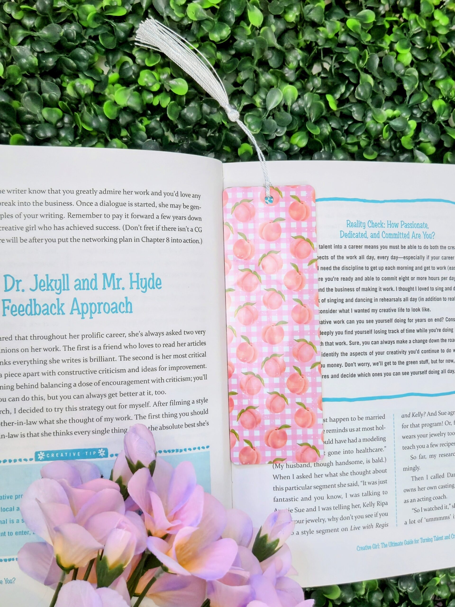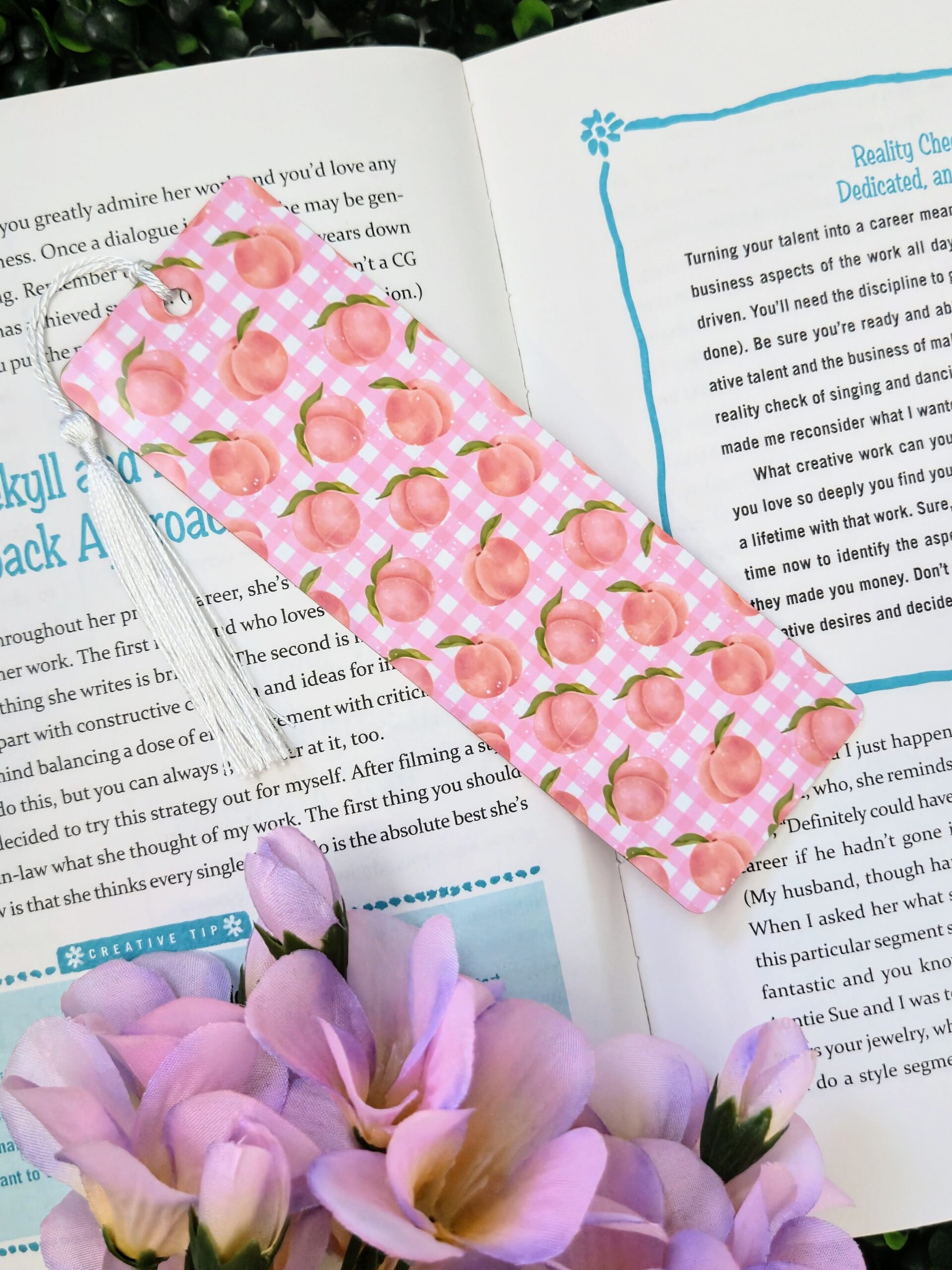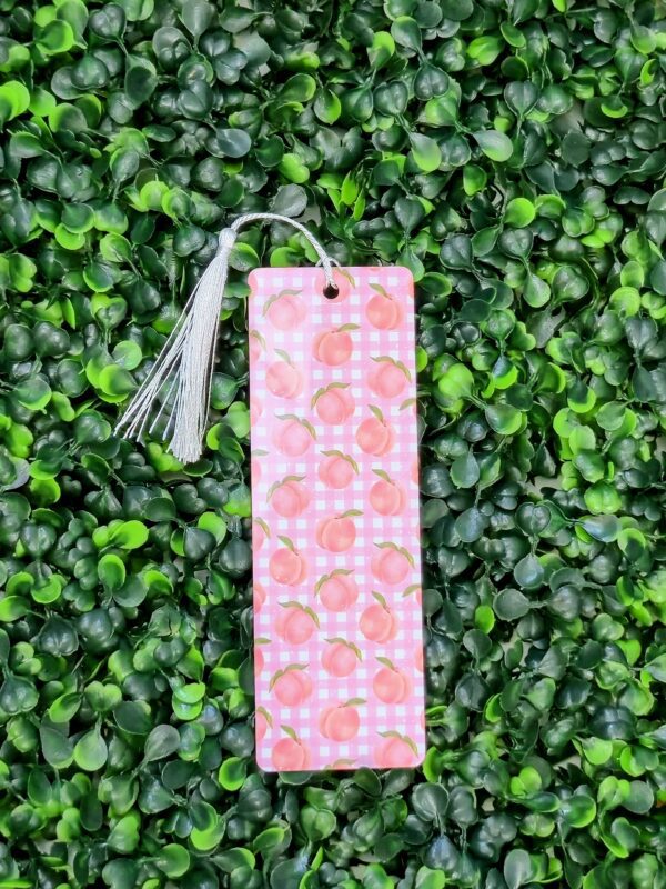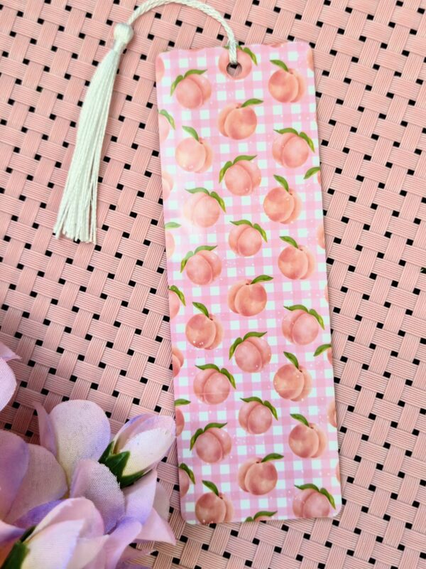 Brighten your page with our adorable Peach Gingham Metal Bookmark! Made from high-quality aluminum, this durable bookmark features a double-sided design: one side shows a pink gingham background adorned with ripe peaches, while the reverse delivers matching vibes with the same design. The glossy finish and soft silver tassel add a luxe feel to every flip of the page. Perfect for gifting or adding flair to your personal collection.