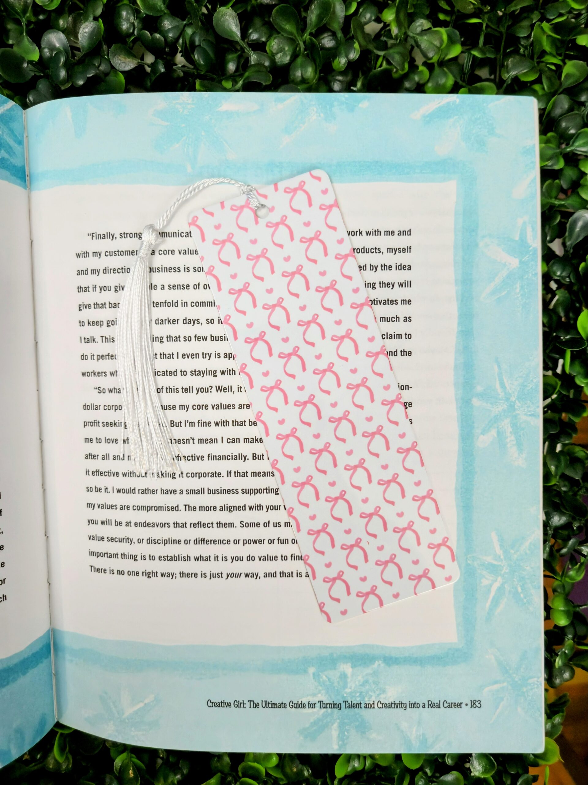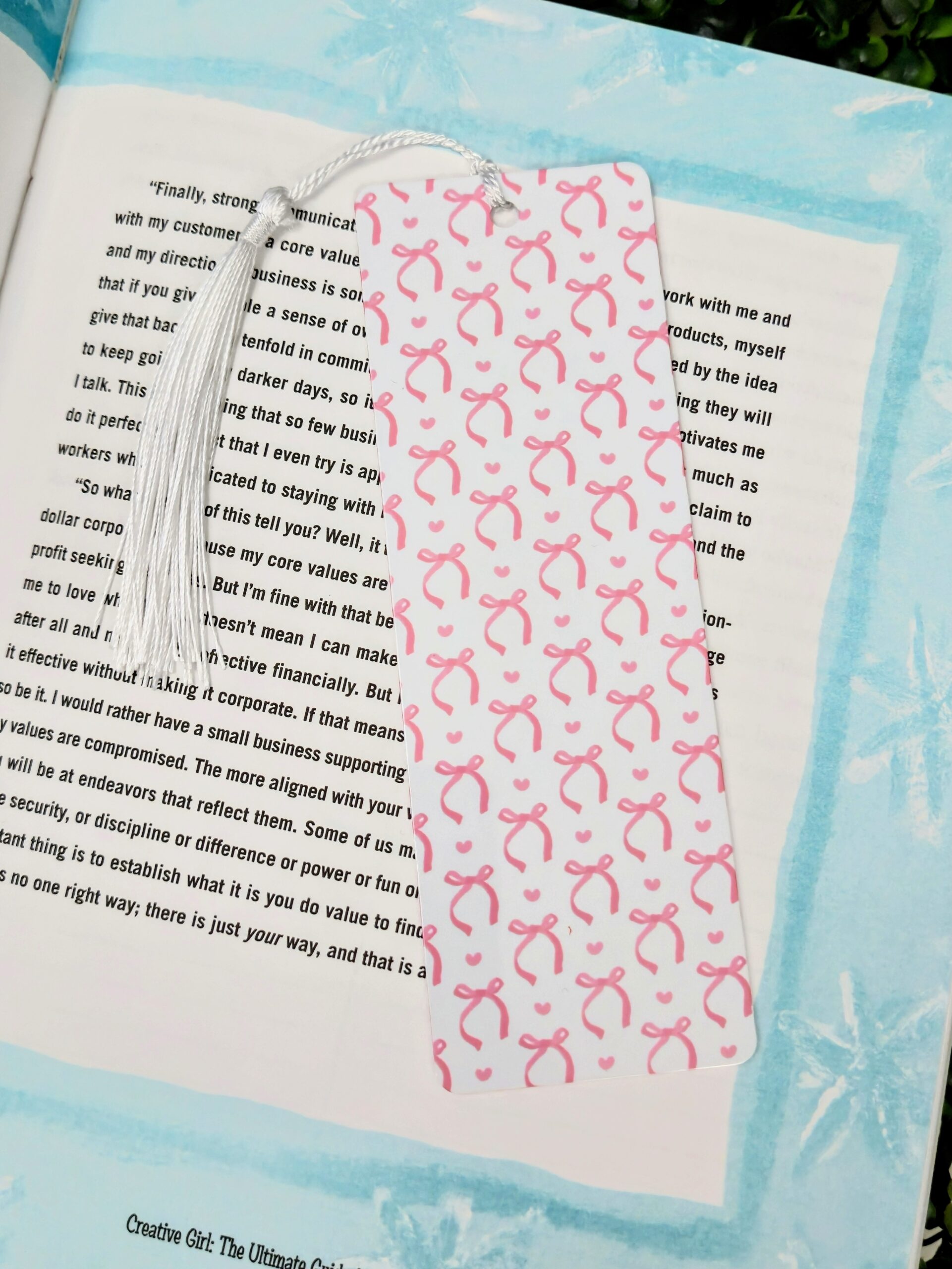 Sweeten your reading time with our Pink Bows Metal Bookmark! With a double-sided print, this glossy aluminum bookmark is designed to make your books pop. The white tassel adds the perfect polished touch, and its sturdy metal body ensures it won’t bend like traditional bookmarks.