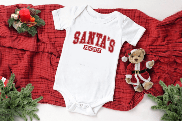 Transform your holiday season into a magical family affair with our adorable “Santa’s Favorite” baby bodysuits! Perfectly matching our “Santa’s Favorite” t-shirts and sweatshirts for adults, these bodysuits make coordinating outfits a breeze, turning every family gathering into a charming showcase of festive spirit.