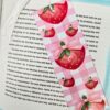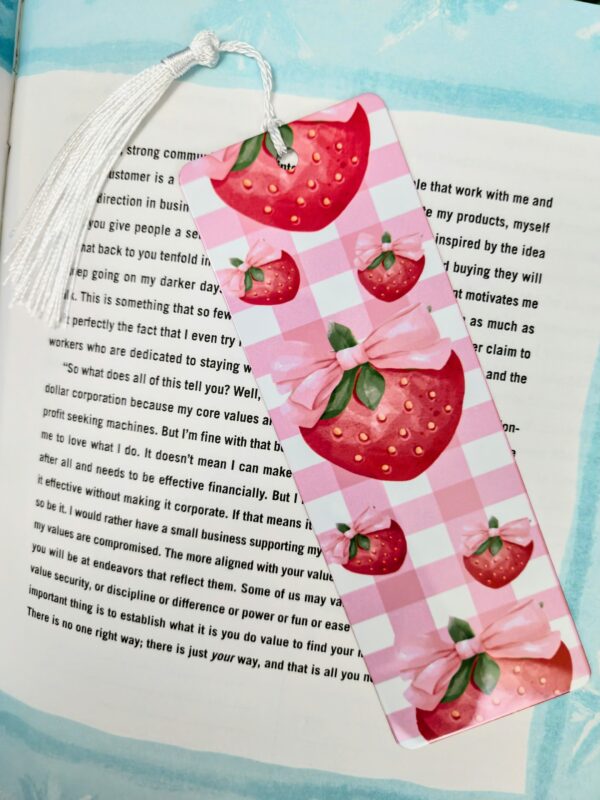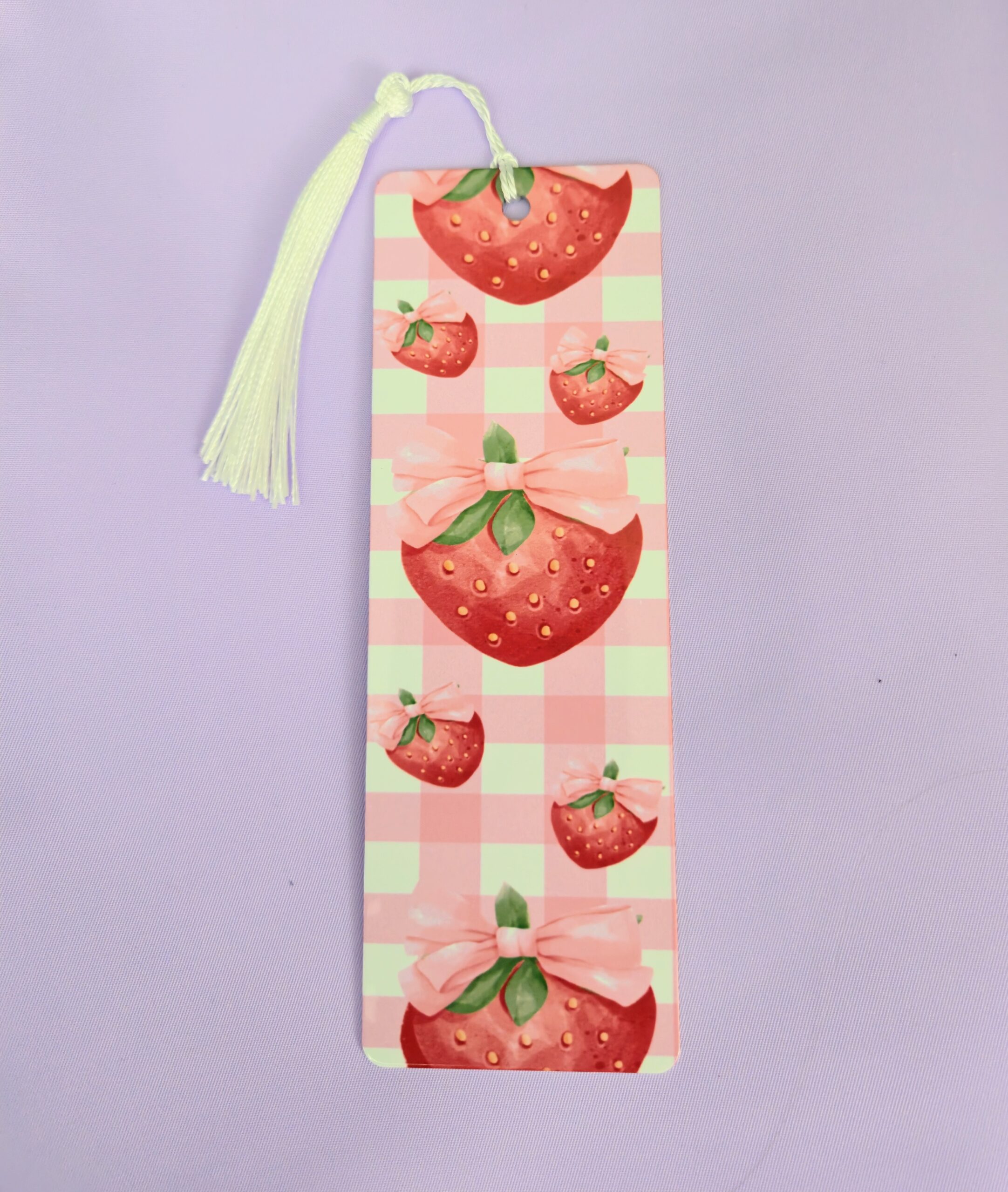 Sweeten your reading time with our Strawberry Gingham Metal Bookmark! With a double-sided pink cherry & bow print on soft pink gingham, this glossy aluminum bookmark is designed to make your books pop. The white tassel adds the perfect polished touch, and its sturdy metal body ensures it won’t bend like traditional bookmarks.