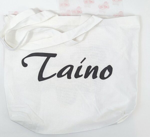 ¡Hola amigos! Are you looking for a cool and unique tote bag that screams style and eco-friendliness? Look no further! Introducing the white cotton tote bag with the Taino Sun Petroglyph on one side and the word “Taino” on the other side, exclusively available here at Fui Fuio by Ktna!