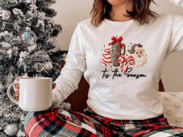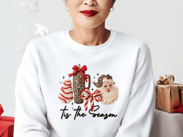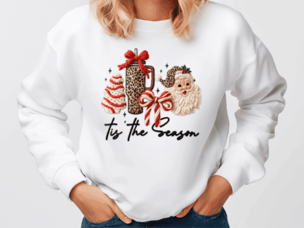 Turn up the holiday glam with our ” ‘Tis The Season” Leopard Santa Crewneck! This eye-catching design features a leopard print gift box, striped Christmas tree, crossed candy canes, and a smiling Santa in a leopard hat – finished with sparkly accents and festive flair.