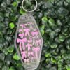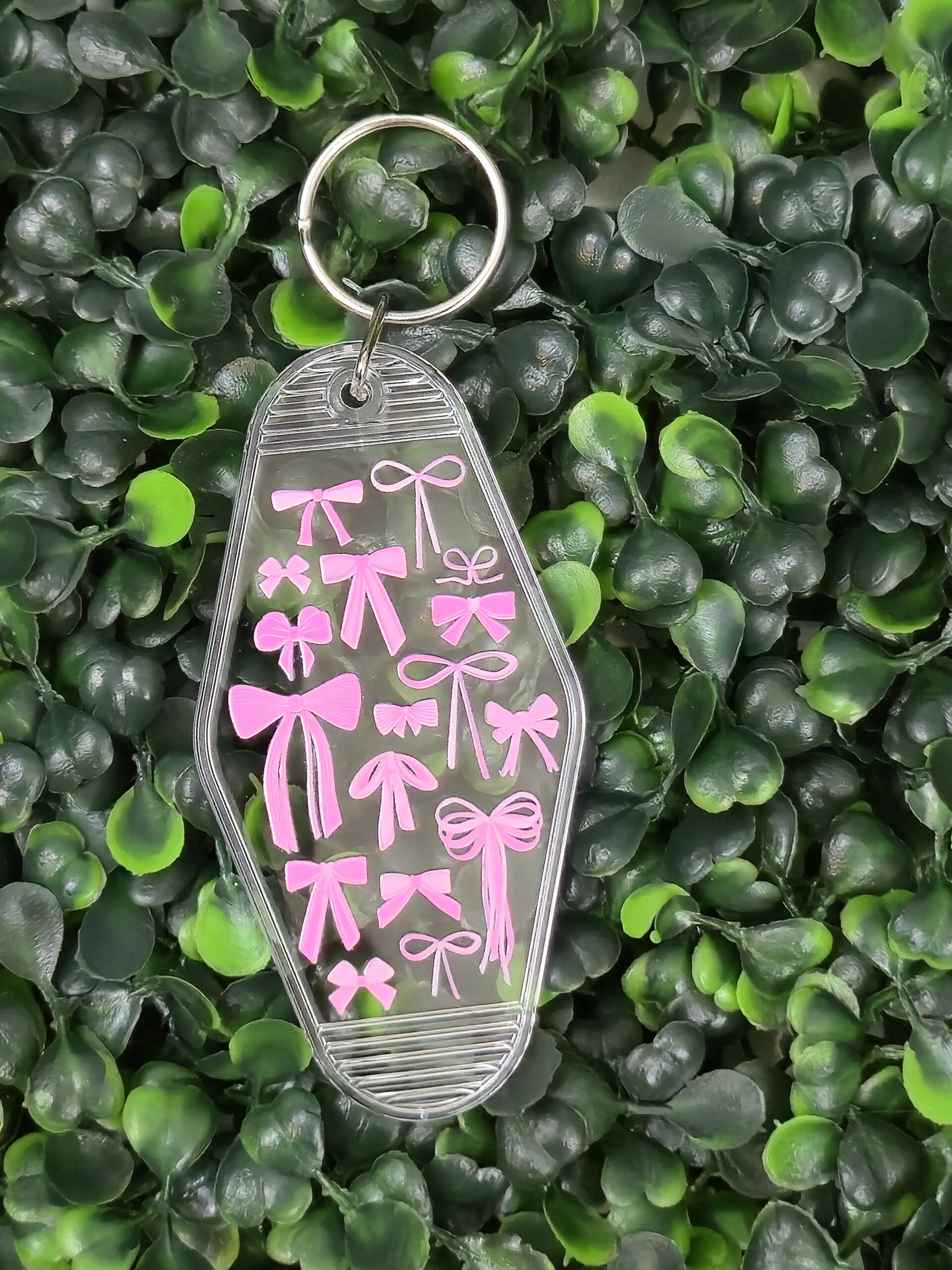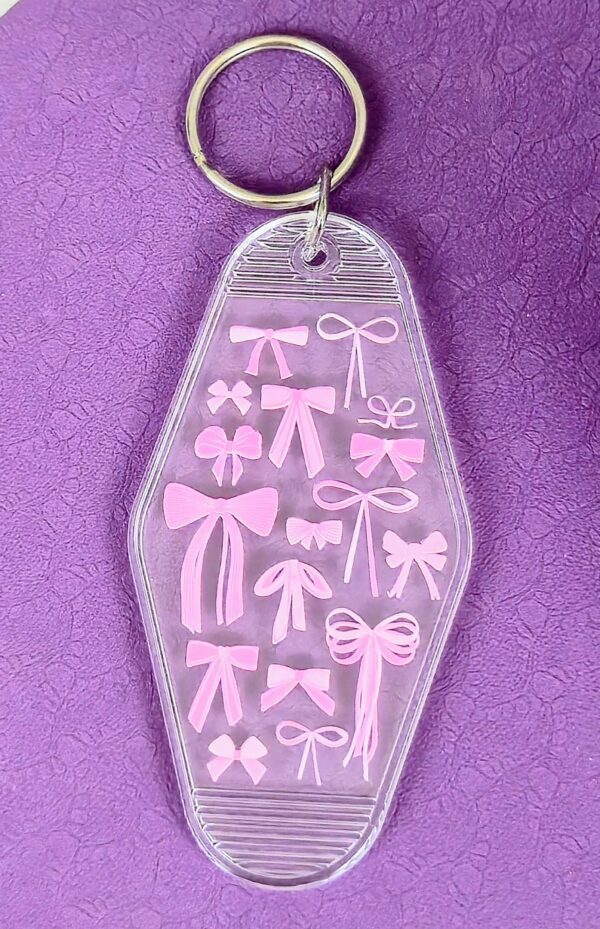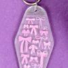 This varied Pink Bows Motel Keychain is the perfect accessory for lovers of cute and feminine vibes. Designed in a retro motel-tag style with an all-over print of baby pink bows and little hearts, it adds charm to any keyring or bag.